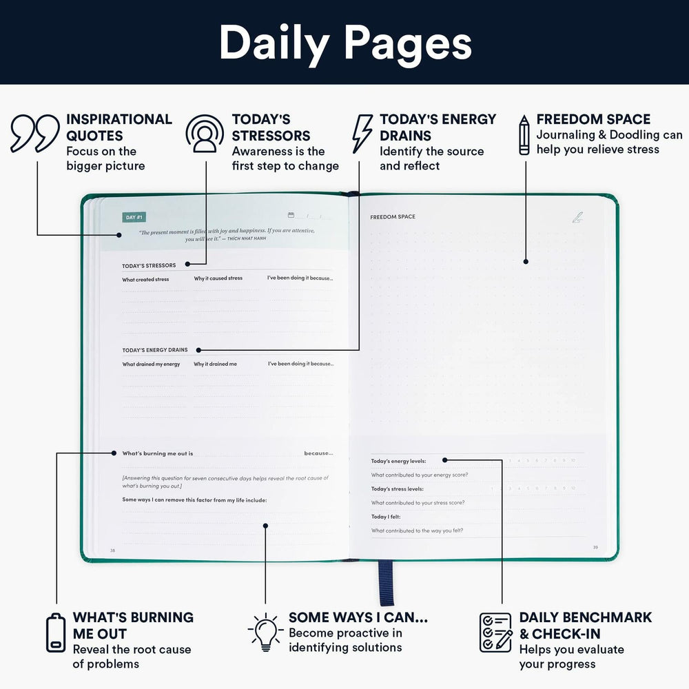 - STRESS RELIEF JOURNAL: Organize your life and tackle anxiety with this templated notebook. This anxiety journal for women features prompts and activities to help you find healing and positivity. Sized 5.75" x 8.5" with smudge-proof paper, it's a self-improvement journal that truly supports your growth.