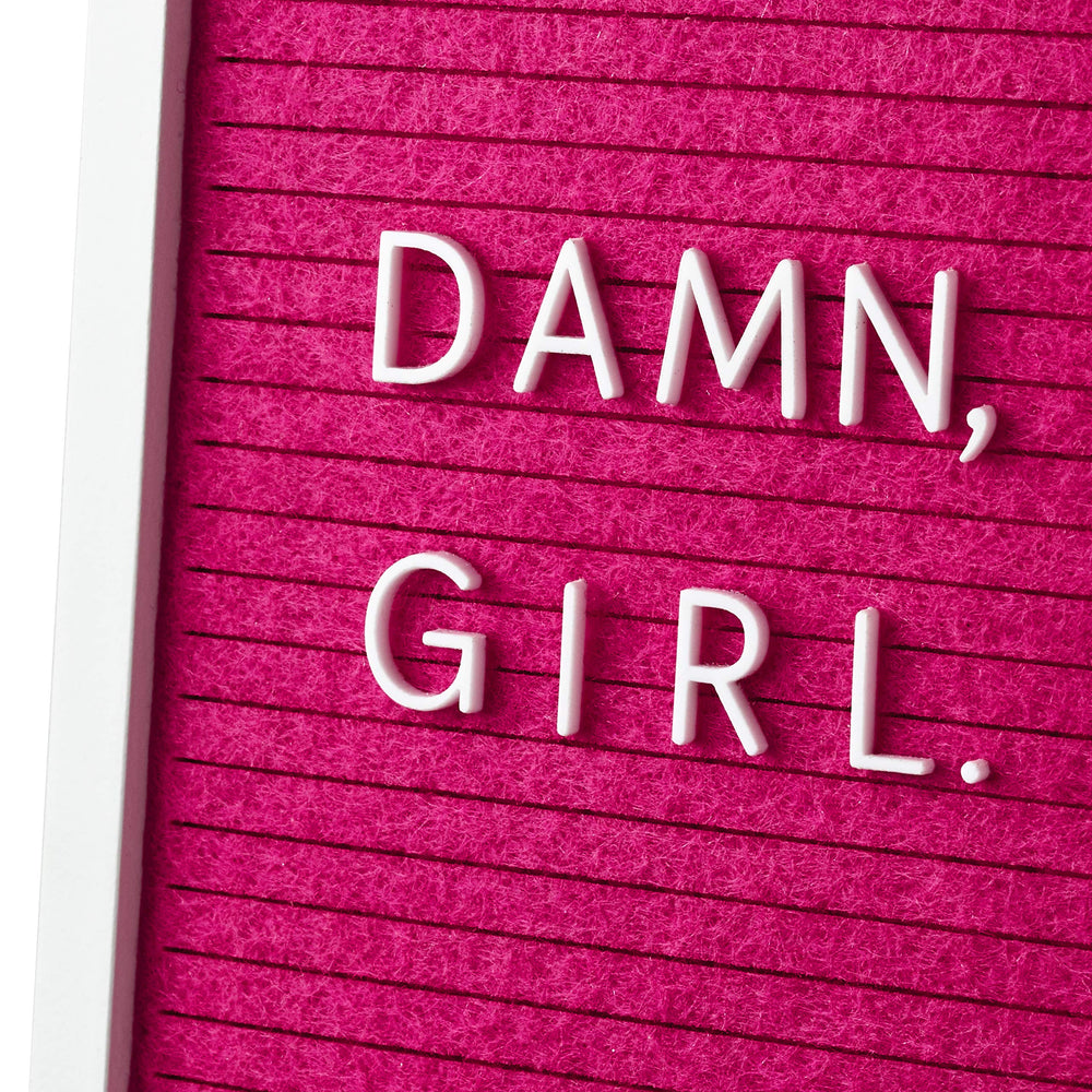 Cover a pink felt letterboard design with letters reading "Damn, girl." Inside reads: "Birthdays look good on you."