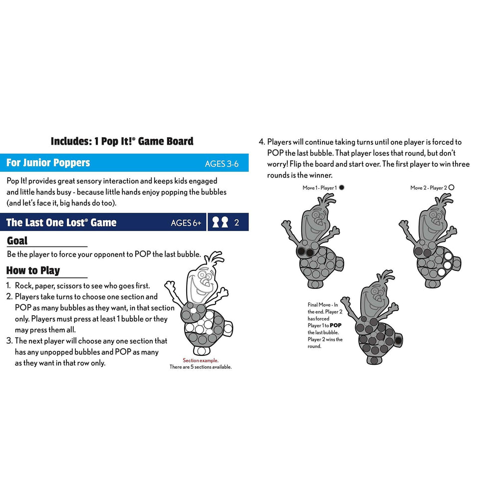 So many ways to have fun! For Junior Poppers (under 6) sensory fun that keeps the little ones busy popping and learning fine motor skills. A game for POP stars (6 and over) Play a clever 2-player game that travels anywhere. Just don't be the last one to pop!