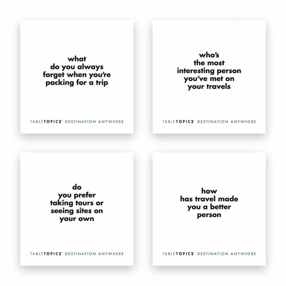 Tourism Tales: Share and relive your best travel moments with the 135 fun conversation cards in TableTopics Destination Anywhere.